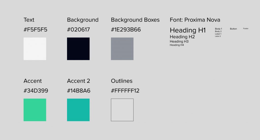 Für das High-Fidelity-Design wurde sich gegen den bisherigen bläulichen Akzent entschieden, um ein frisches neues Theme aufzubauen. Für den Kontrast zu einem sehr dunklen Blau als Hintergrund wurde ein Mint-Grün und eine Variation davon als Akzent festgelegt. Die Schriftfarbe ist ein leichtes Off-Weiß, um einen nicht ganz so scharfen Kontrast zu erzeugen, der lesbar bleibt.