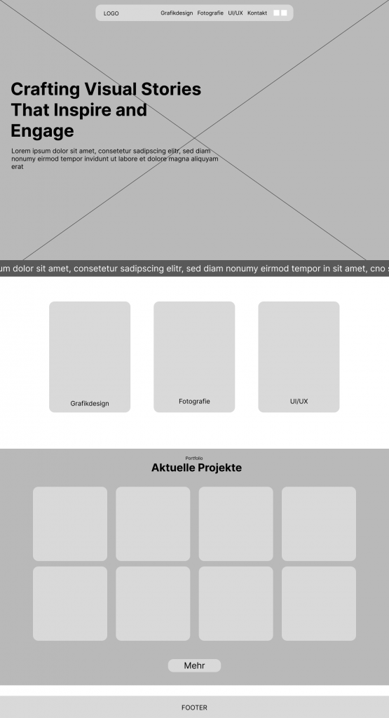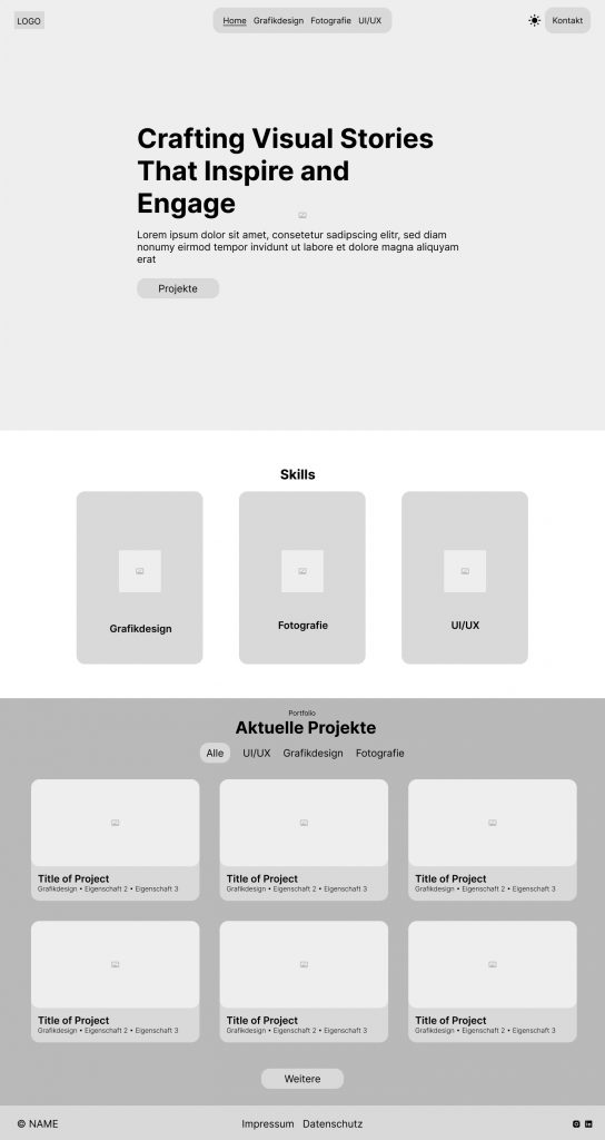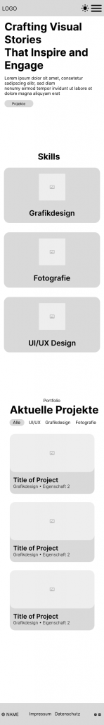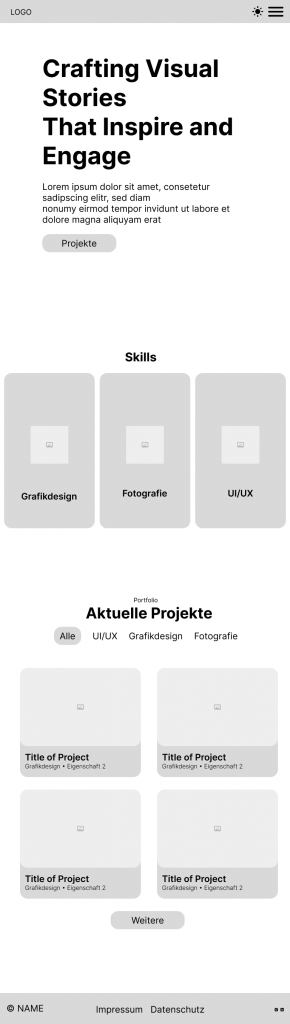 Durch das besagte Theme war die Webseite außerdem recht generisch aufgebaut und entsprach nicht meiner Vorstellung einer Webseite, die meine Skills und Projekte präsentieren soll. Schließlich hat das Aufkommen von Interesse an UI/UX-Design dafür gesorgt, dass ich mit der Webseite einen Neustart in den Bereichen Grafikdesign, Fotografie und schließlich UI/UX starten wollte.